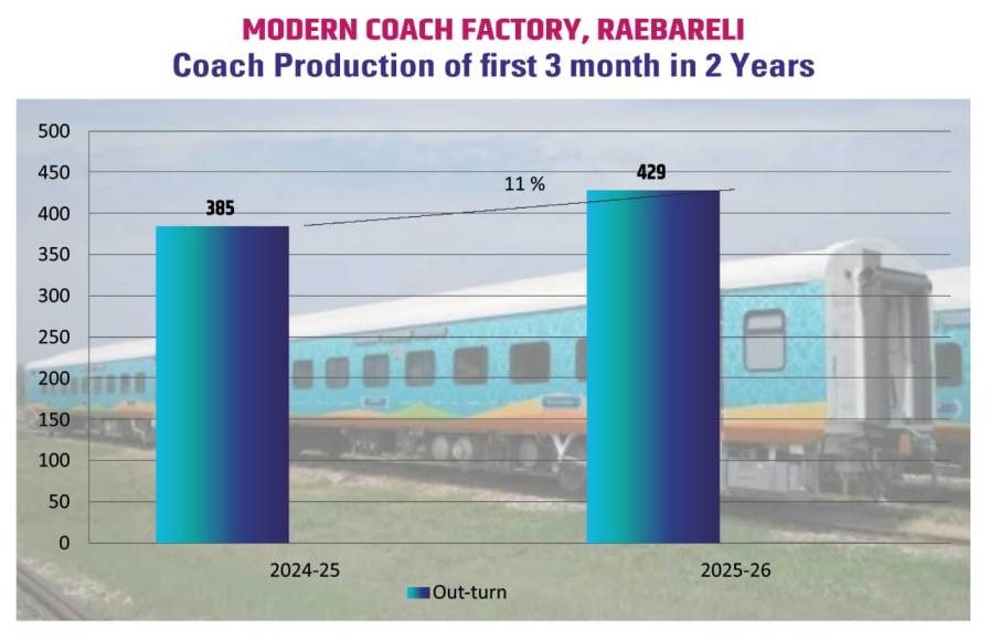 रायबरेली। आधुनिक रेल डिब्बा कारखाना, रायबरेली ने वित्तीय वर्ष 2025-26 के प्रथम तीन महीनों में कुल 429 कोचों का सफलतापूर्वक निर्माण किया है, जो कि पिछले वर्ष की इसी अवधि के 385 कोचों की तुलना में 44 कोच अधिक है। उत्पादित 429 कोचों में ‘दीन दयालु’ श्रेणी के सर्वाधिक 111 कोच, 83 स्लीपर कोच, 36 एसी-3 टियर कोच एवं 10 एसी-2 टियर कोच शामिल हैं।
